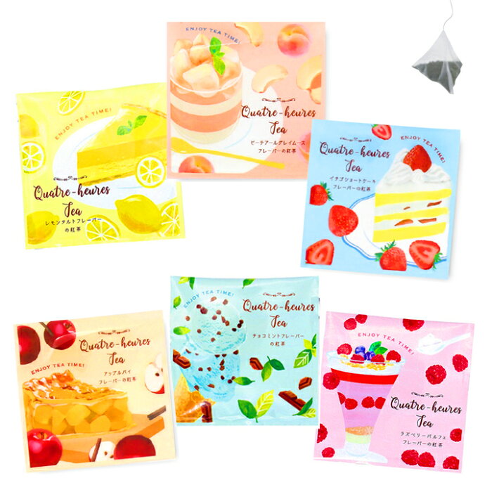 ●チョコミント:甘いチョコレートにすっきりとしたミントの香り広がるフレーバー紅茶●レモンタルト:すっきり爽やかなレモンと香ばしいタルト風味のフレーバー紅茶●ラズベリーパルフェ:クリームと甘酸っぱいラズベリーがふわりと香るフレーバー紅茶●イチゴショートケーキ:まろやかなクリームと爽やかなイチゴがふわりと香るフレーバー●ピーチアールグレイムース:みずみずしい桃と香り豊かなアールグレイの組み合わせが上品なフレーバー●アップルパイ:甘酸っぱいリンゴとシナモンの香りが口いっぱいに広がるフレーバー 美味しそうなパッケージイラスト フレーバー毎に違う癒されるキュートなイラストで、淹れる度にたのしく♪